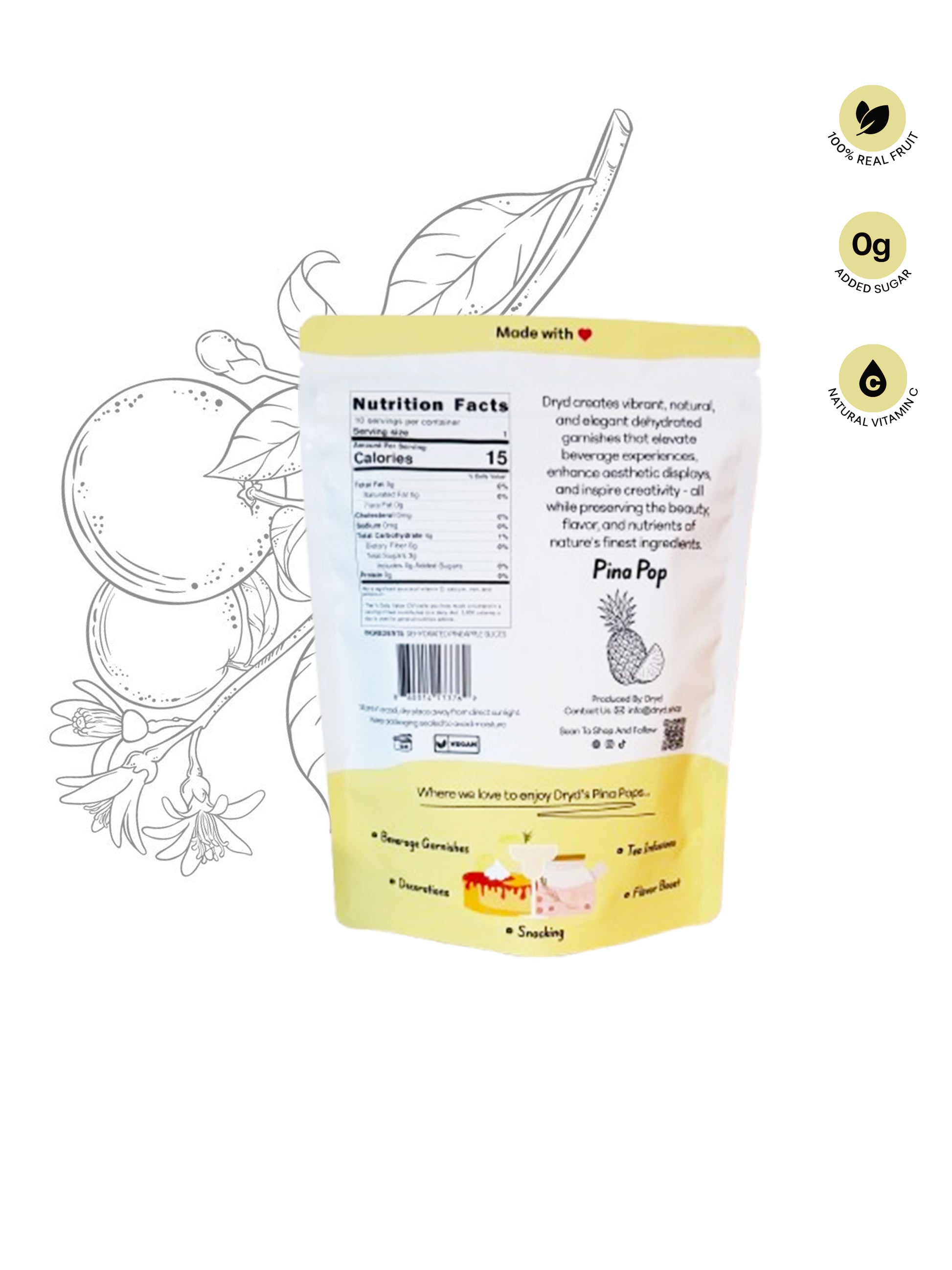 Dryd’s dehydrated pineapple delivers a burst of bright, exotic sweetness in every slice. Naturally vibrant and deliciously tangy, each piece is carefully dehydrated to preserve its juicy flavor, golden color, and naturally chewy-crisp texture. Perfect for enhancing beverages and elevating desserts, smoothie bowls, and grazing boards with a hint of tropical sweetness.